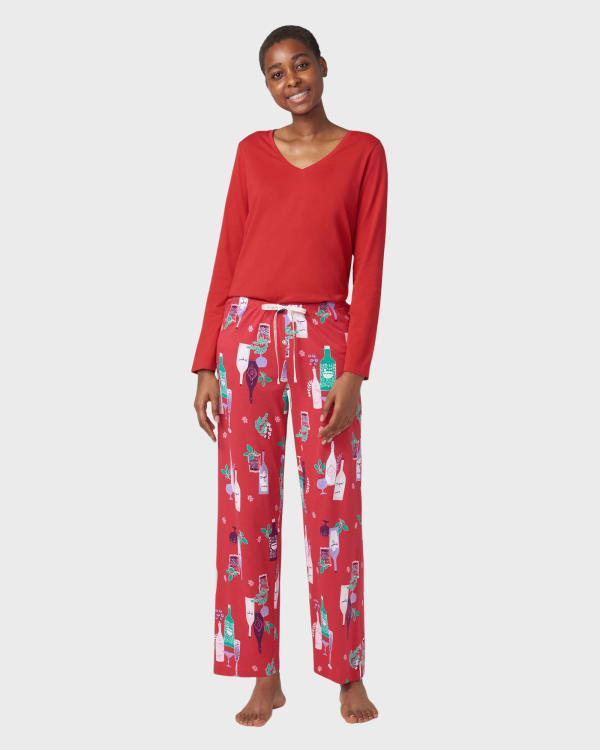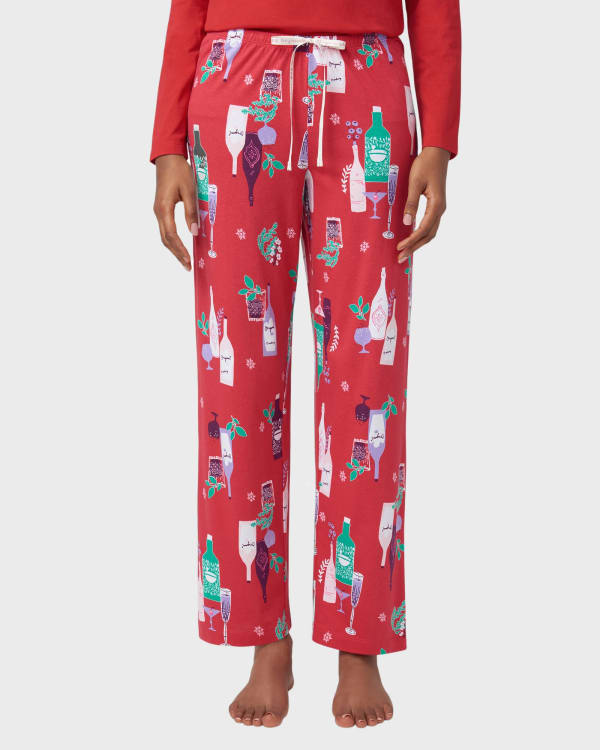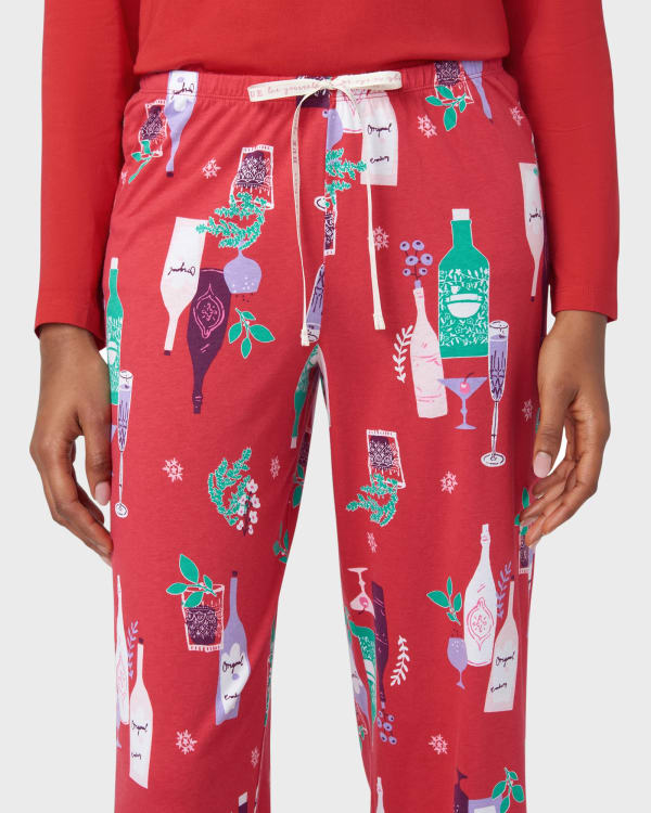 Sip back and relax. These pajama pants mix merry and mellow with a fun cocktail print in a soft cotton-rayon blend that feels as good as your favorite nightcap. Finished with a drawstring waist and easy fit.