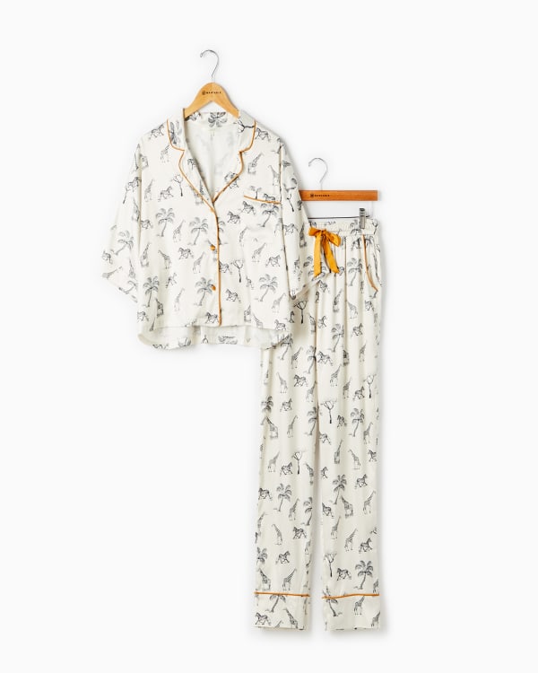 Comfy. Supercute. Ultraluxe. Do we have to go on? Done in a playful safari print, the Jolie Safari Set includes a classic button-up pajama top and matching pull-on bottoms with a comfy elastic waistband. Detailed with contrast satin trims. (Poly Satin: 100% Polyester) Imported. Order now & enjoy free shipping & returns.