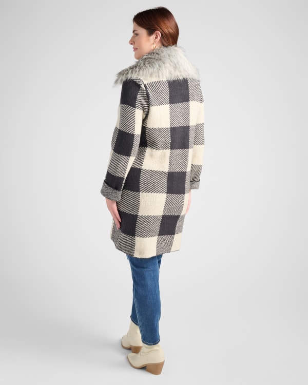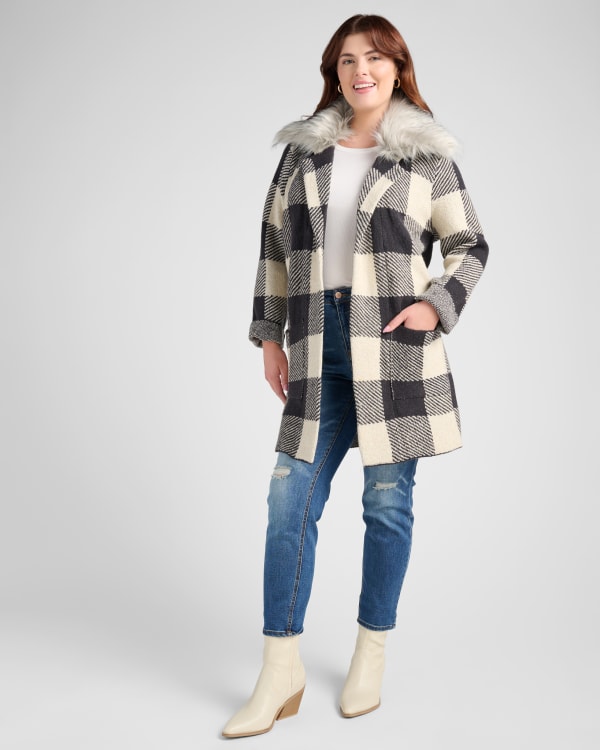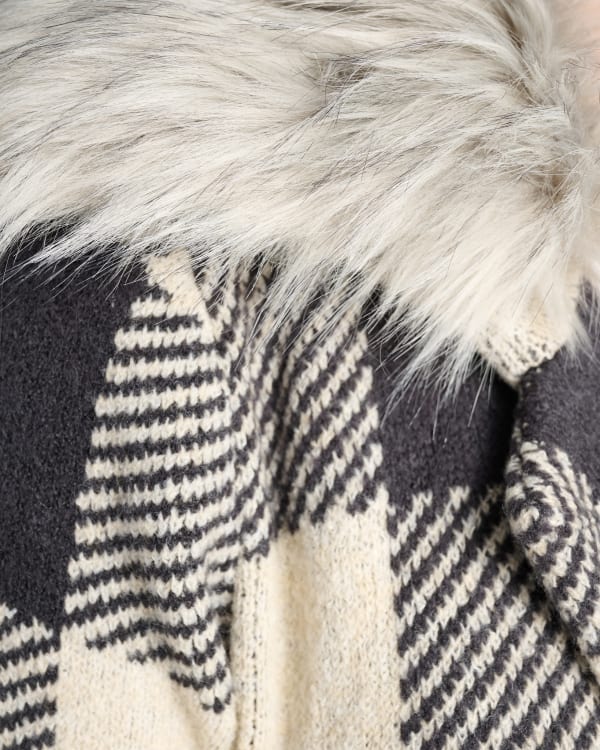 Putting this coatigan on is like a chic warm hug! On-trend with an open front, notched lapels, two pockets and a removable faux fur collar. Midweight and so soft in a cozy plaid knit.