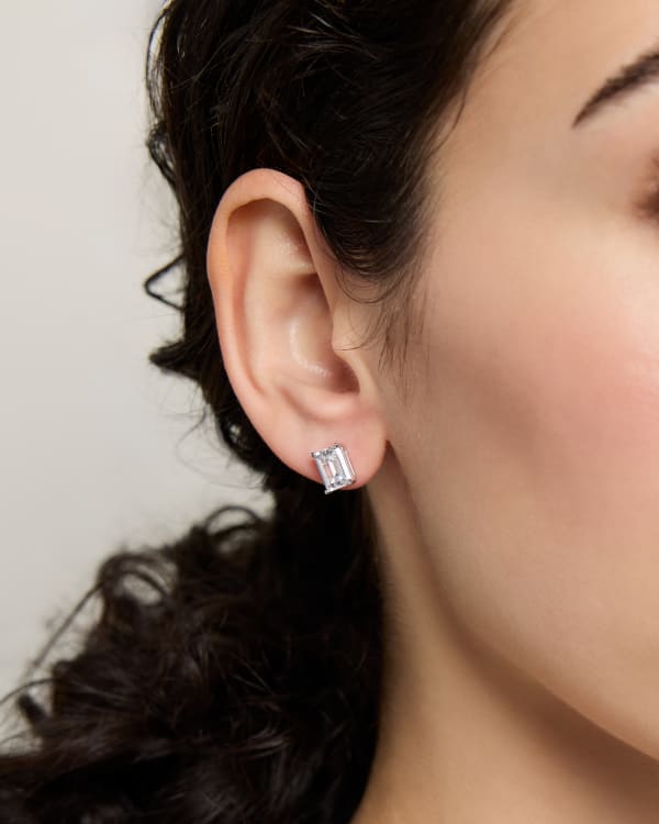 Glam up your day with these dazzling stud earrings! Large emerald cut CZ stone measures 6x4mm and sparkles on a .925 sterling silver post finished in pure platinum. Made in the USA of materials you can count on.