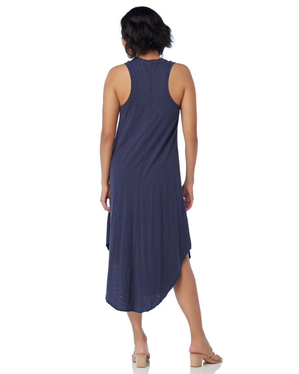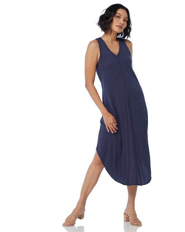 Going out and looking great is easy with this casual midi dress! Relaxed fit with a V-neck, ribbed trim, raw-cut rounded hem and a stylish center seam. Made from breathable 100% cotton with a touch of stretch.