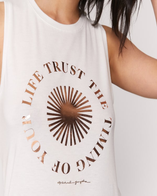 Add some inspiration to your active wardrobe with this Trust the Timing Chakra Tank. Featuring a metallic print, a crew neckline and a relaxed silhouette, it's the perfect pairing piece with your favorite leggings and a strappy sports bra.