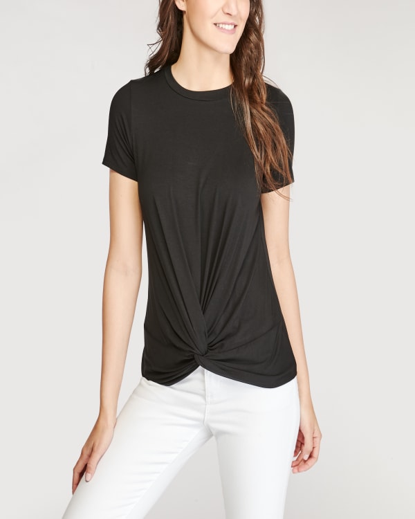 A playful knotted hemline adds stylish interest to this jersey-knit top. Its semi-fitted silhouette makes it easy to pair with your favorite denim or work bottoms.
