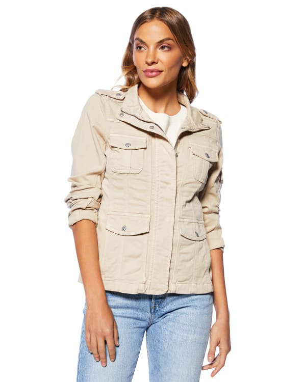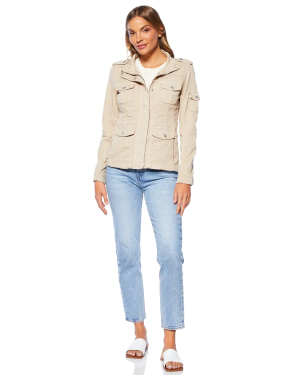 Flawless layer, reporting for duty! This functional utility jacket features a stand-up collar, zippered snap-up front and five pockets. Soft, yet durable in an oh-so-breathable cotton blend. Looks great over both graphic tees and casual dresses so you can switch up your vibe in a flash.