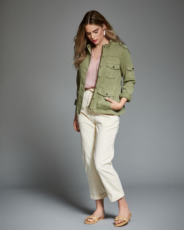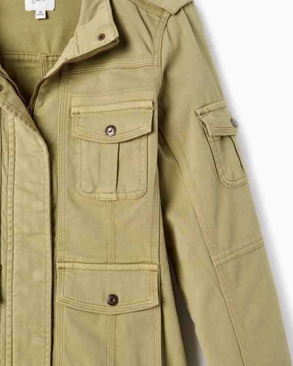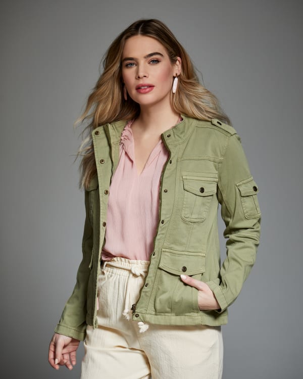 Layer on some early 2000s vibes! This functional utility jacket features a stand-up collar, zippered snap-up front and five pockets. A versatile piece that looks great over both graphic tees and casual dresses. Tested by our expert personal stylists to look great on you— order now and enjoy free shipping and returns. 98% cotton, 2% spandex, machine wash cold.