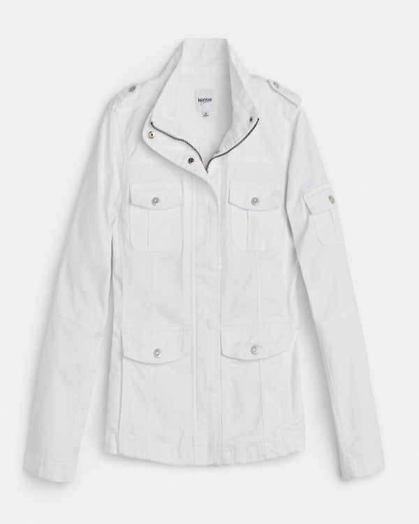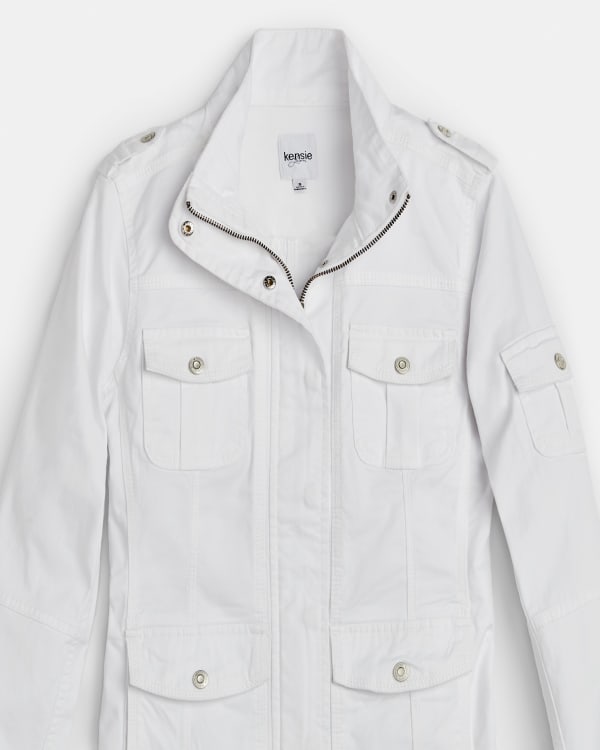 Layer on some early 2000s vibes! This functional utility jacket features a stand-up collar, zippered snap-up front and five pockets. A versatile piece that looks great over both graphic tees and casual dresses. Tested by our expert personal stylists to look great on you— order now and enjoy free shipping and returns. 98% cotton, 2% spandex, machine wash cold.